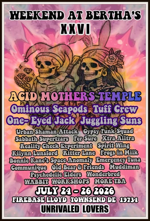 Acid Mothers Temple, Ominous Seapods, Tuff Crew, One-Eyed Jack, Juggling Suns, Urban Shaman Attack, Gypsy Funk Squad, Sabbath Suprtzars, Fer Sure, Xtra Alltra, Reality Check Experiment, Spirit Wing, Kilynn Lunsford, Ritter Lane, Frogs In Milk, Bonnie Kane's Space Anomaly, Emergency Tuna, Communique, Old Bear & Friends, Muddiman, Psychedelic Elders, Wonderbed, Wabbit Workshops, + More TBA